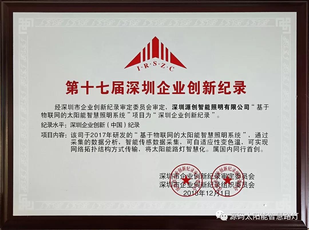 2018年12月29日榮獲【人工智能 AI 網絡營銷 太陽能路燈行業經典案例(深圳)】榮譽